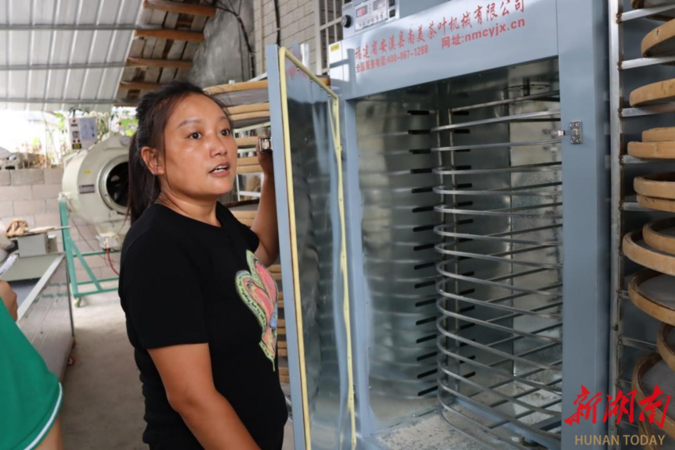志愿者们采访了正在辛勤烘茶的张大姐一家。张大姐热情地招呼志愿者们进家了解详细情况。烘干机、翻炒机、揉茶机……原来张大姐一家主要经营莓茶的粗加工,“杀青、揉捻、杀二青、复揉、发酵、干燥……”张大姐为志愿者们介绍莓茶粗加工的步骤。